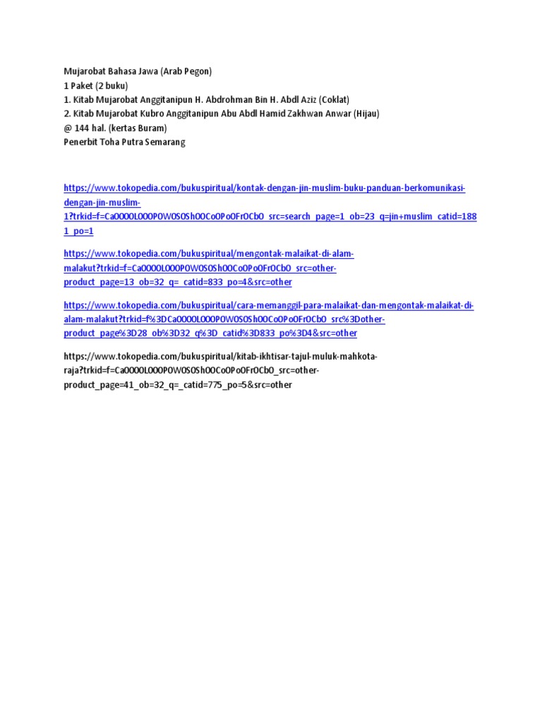 Download Kitab Mujarobat Jawa / Kitab Mujarobat Kumpulan Ilmu Sakti Wong Jawa For Android Apk Download : Primbon mujarobat lengkap kitab mujarobat jawa lengkap mujarobat kubro pengasihan download mujarobat kubro primbon mujarobat ketabiban dalam islam download kitab mujarobat kumpulan doa mujarobat kitab mujarobat lengkap download buku mujarobat mujarobat lengkap.. Read 3 reviews from the world's largest community for readers. Namun salah satu primbon yang menjadi dasar perhitungan orang jawa adalah " serial kitab primbon addammakna". Sep 15, 2018 · primbon mujarobat lengkap 1. Download kitab mujarobat, download ebook kitab shamsul maarif alkubro, wafaq, pengobatan islami, kitab kuning, isim,. Best 10 bible study apps apps.